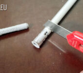 Der Abroller wird auf den Tisch gelegt oder an die Wand gehängt. Abgeschnitten wird die Folie mit einem Stanley-Messer in einer eingefrästen Rille.