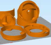 Die Orientierung im 3D-Drucker sollte wie abgebildet sein. So wird dann kein Stützmaterial benötigt. Es gibt zwei kleine Stellen am Saugrohr, wo das Stützmaterial in der Konstruktion enthalten ist. Diese können leicht weggebrochen werden können. Die Absaugung besteht aus fünf Teilen (rot) und ein paar Schrauben, die man eigentlich sowieso zu Hause hat bzw. bei der Maschine dabei sind.