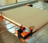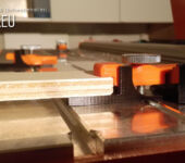 Es sind Werkstücke von 4 bis 18 mm ohne Umbau möglich. Außerdem gibt es jetzt neu ein Unterlage, so dass man in den meisten Fällen keine Opfer-Platte benötigt. Diese Unterlagen haben seitliche Nasen, sodass sie sich mit dem Niederhalter mit drehen und immer optimal unter dem Druckpunkt befinden.
