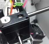 Das Teflon-Ding ist total überhitzt, alles ist extrem verdreckt, verbogen und hat unglaubliche Schrammen. Die Heizpatrone fällt von selbst raus, weil wieder mal eine falsche Schraube verwendet wurde, die nicht klemmt. Na ja, auch hier alles mal zerlegen, putzen, eine neue Düse rein und Alles etwas gerade biegen.